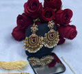 The chandbali earrings feature intricate Kundan-style work with red and gold accents, enhancing the ethnic charm.